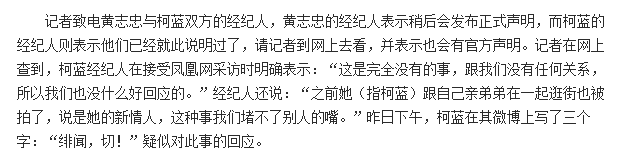 然而,两年后,黄志忠和结婚13年的何音低调离婚,当时还有传柯蓝是“小三”,疑似卷入两人离婚的风波。后来,柯蓝也在微博上澄清,这是绯闻。
