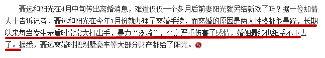 然而谁也没想到这对昔日的“金童玉女”却在不久后离婚收场。有报道说,聂远和前妻王惠(艺名:阳光)离婚的原因是性格不合,而且还经常大打出手。