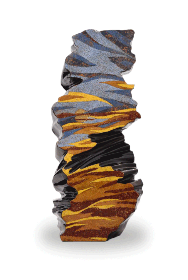 《天际》是一个具有现代感的漆塑作品,大胆地打破了漆器之传统造型,以不规则的抽象形营造空间的质感,侧面的横向断面层次丰富,使人产生延伸的外扩感;装饰上则用了镶嵌、罩漆、研磨等技法,完美地将平面装饰与立体造型、二维与三维有机结合在了一起。