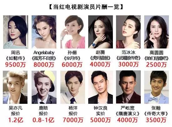 此外,孙俪2015年出演《芈月传》(81集)的片酬也达到6000万,这是经过“限薪令”后,孙俪片酬从85万一集减到50万一集之后的总体价格;赵薇2014年的《虎妈猫爸》(45集)片酬达3000万,而同年范冰冰的《武媚娘传奇》(96集)片酬也是80-90万一集,总片酬3000万;高圆圆2013年则凭《咱们结婚吧》收获2500万片酬,30-50万一集。