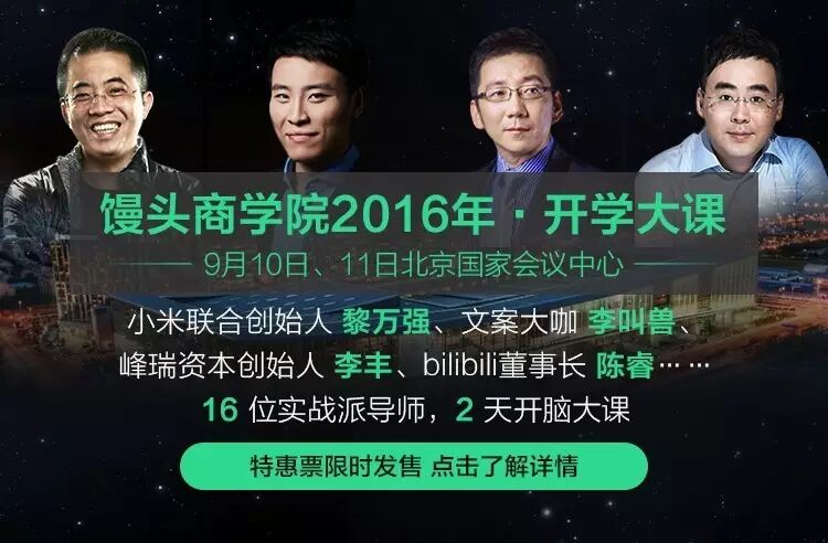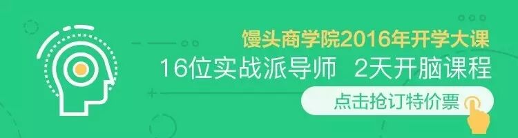 重磅推荐:馒头商学院2016开学大课预售中,小米黎万强、B站董事长领衔16位导师主讲,2天开学大课+互联网产品、运营、营销专场课,为你拔高视野、提高技能。点击文末“阅读原文”,即可了解详情~
