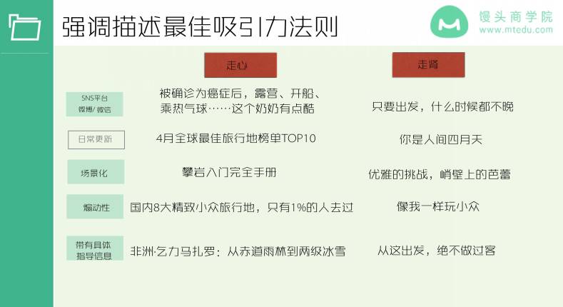 大家应该都看过很多旅游产品推送的文章标题,比较走心的就会讲,“被确诊为癌症之后,露营开船乘热气球,这个奶奶有点酷”。走肾的就是“只要出发,什么时候都不晚”。后者显然没有前者的描述性和吸引力性更强。
