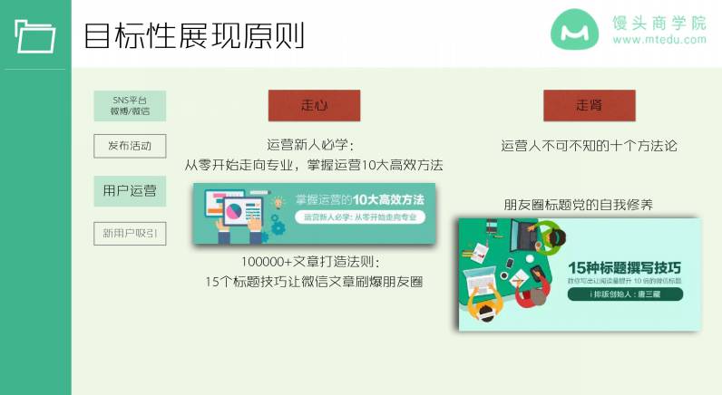 目标性展现原则就是把目标写在标题上,写在最醒目的地方。大家可以参考馒头微课的标题,这个标题让我很想去听。比如原本说运营人不可不知的10个方法论,会觉得很枯燥,但是告诉你从零开始,走向专业,有一种特别速成,包教包会这种感觉。很多新用户都会被这样数字化的东西吸引。