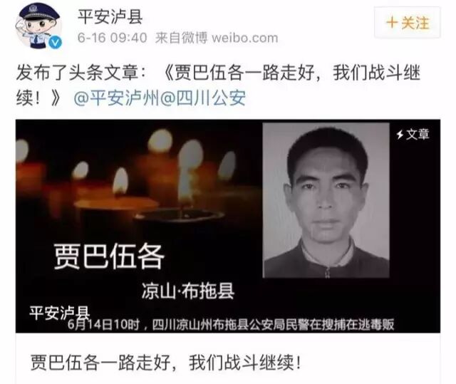 这是我的亲堂弟贾巴伍各。6月14日十二点十分点,持枪的贩毒歹徒夺走了他三十四岁的生命。人民失去了一个好警察,而我,失去了一个亲人,失去了一个生命里最踏实最靠谱的亲人。