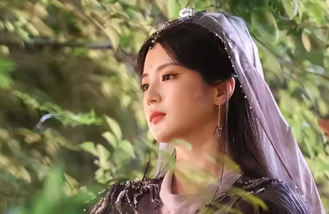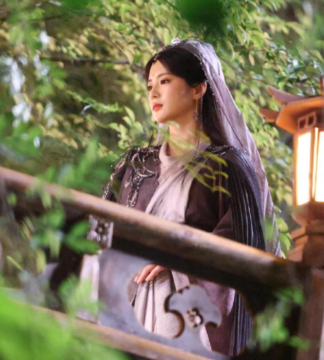 张雅钦在《咸鱼飞升》中饰演女配何青青一角,路透图中她穿着一身紫衣站在那儿像极了悲天悯人的观音。