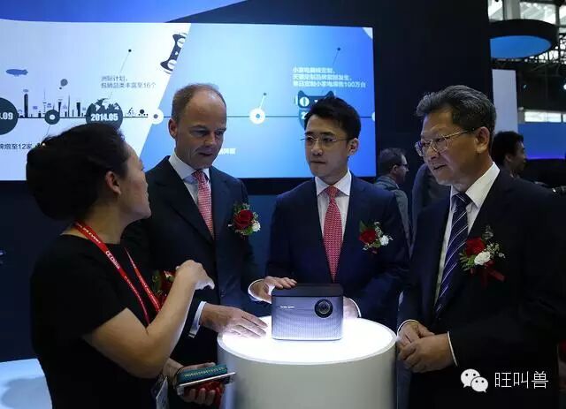 深圳市副市长陈彪、IFA CEO Dr.Christian Goke、天猫电器城总裁印井参观深圳IFA展会——天猫电器城展台所展出的定制新品,大家对极米无屏电视爱不释手