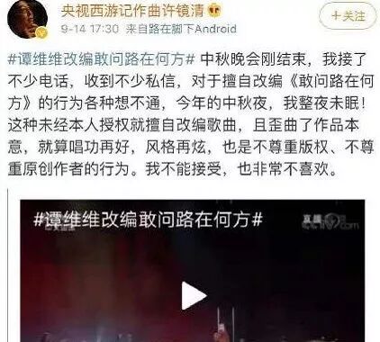 确实是争议不小,很多人表示谭维维对这首歌的魔改(唢呐、失真吉他、双踩)是对经典的一种亵渎,而《敢问路在何方》歌曲的原作者许镜清的一条微博,则把整个事件推到了舆论的顶峰。