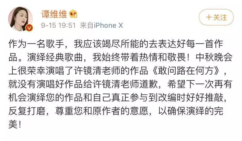 而事实就是,最后真正出来道歉的,似乎也只有谭维维,不过你看看她这个措辞也是很有意思,她说希望下次“再有机会演绎”您的作品和“真正参与到改编时”好好推敲。