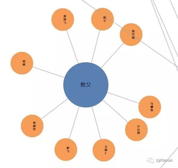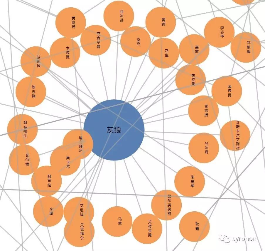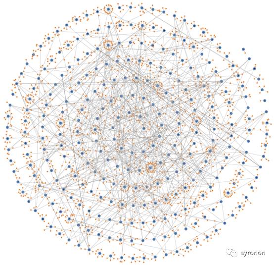 搜集过程一般很难一步到位,往往以为找全了乐手,结果在查另一支乐队时又翻出一堆新的名字。结果雪球越滚越大,最后统计出来总共有293支乐队、1750个乐手。每个乐手都要做一遍粒子群计算,一共花了半个小时。接下来,要通过Visio模块把乐队和乐手在图上画出来,乐队用蓝色的大圆,乐手用橙色的小圆,总共2290根连线,为避免因太过密集而遮住其他元素,用的是半透明的灰线。程序一运行就进入假死状态,经过大概10分钟,分布图才终于画好。