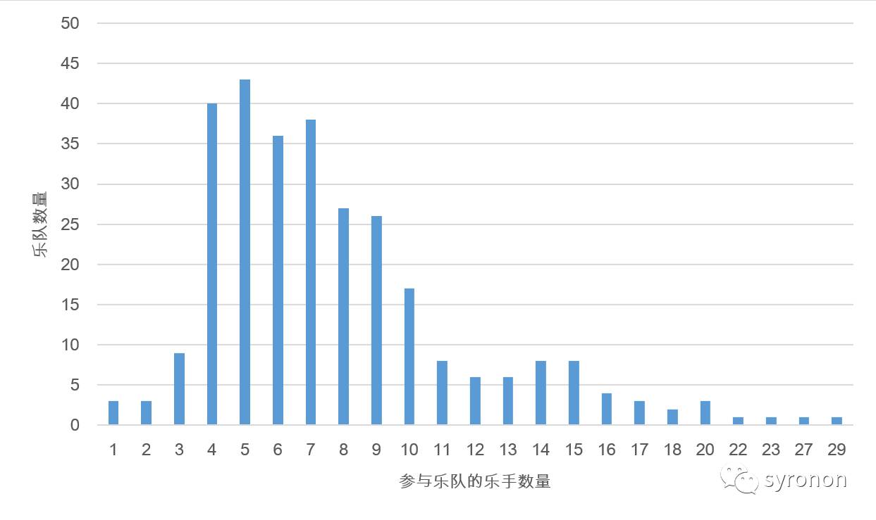 铁打的乐队,流水的乐手,乐队有时候就像是一个客栈,乐手好比房客,一拨一拨地来,又一拨一拨地离开。但从图中的分布来看,大多数乐队其实也只是会更换1~5人(以摇滚乐队通常3~4人的阵容计算),还算比较稳定。不过,人员变动在20次以上的也不少见,像灰狼、AK47、二手玫瑰、冥界,因为各种各样的原因,乐手更替就像走马灯一样。另外,有些乐队更像是松散的音乐集会,像野孩子和旅行者,因为即兴的特点,他们的阵容可以说是没有边界,本文所统计的必定是不完整的。不得不提的是还有些乐队,虽名为乐队,实际上是单人,像英吉沙、游园惊梦、迷魂殿。