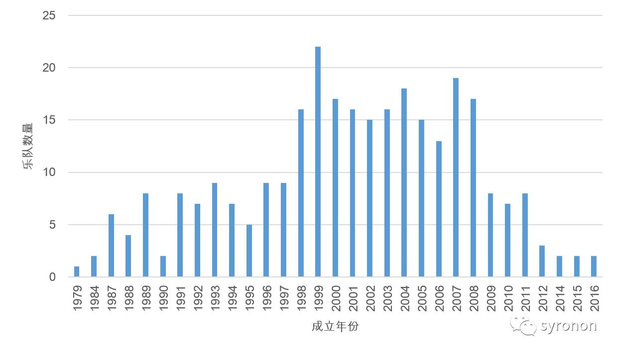 按照很多摇滚编年史所记载的,中国(本文均指大陆地区)第一支摇滚乐队是1979年在北二外成立的万里马王。几年之后,由体制内人员组成的七合板诞生,1984,很有象征意义的年份。但这都还只是copy性质的乐队,直到1986年崔健唱响[一无所有],紧接着1987年出现一批真正意义上的摇滚乐队,中国摇滚才算是正式起步,在1994年达到顶峰。1995年张炬去世,被认为是土摇衰落的标志,但实际上,摇滚只是不再流行于大众,而是转战地下,进入“后革命时代”。受到Guns N’ Roses和Nirvana的影响,大批外省青年投奔北京,扎堆在树村周围,所以世纪之交那几年出现了一波乐队潮,井喷式地冒出大量的金属、新金属、朋克乐队。一般印象里,2003年的非典对强烈依赖于现场演出的摇滚乐是一个毁灭性的打击,但实际上那一年以及之后的几年还是有很多新的乐队组建。图中2008年之后的低潮很难解释,毕竟近些年摇滚市场明显是在走好,也可能只是因为我没统计到。如今,最早的那批老炮大多消失匿迹,而新的乐队尚未崭露头角,土摇的主力就是世纪之交到2009年之间那段时期成立的乐队。