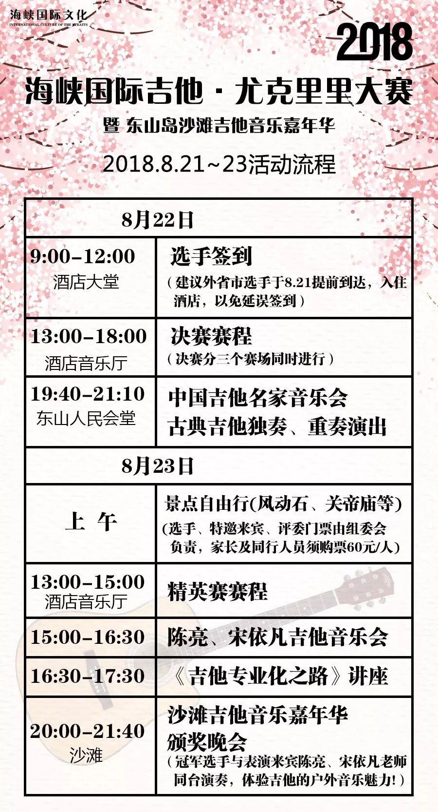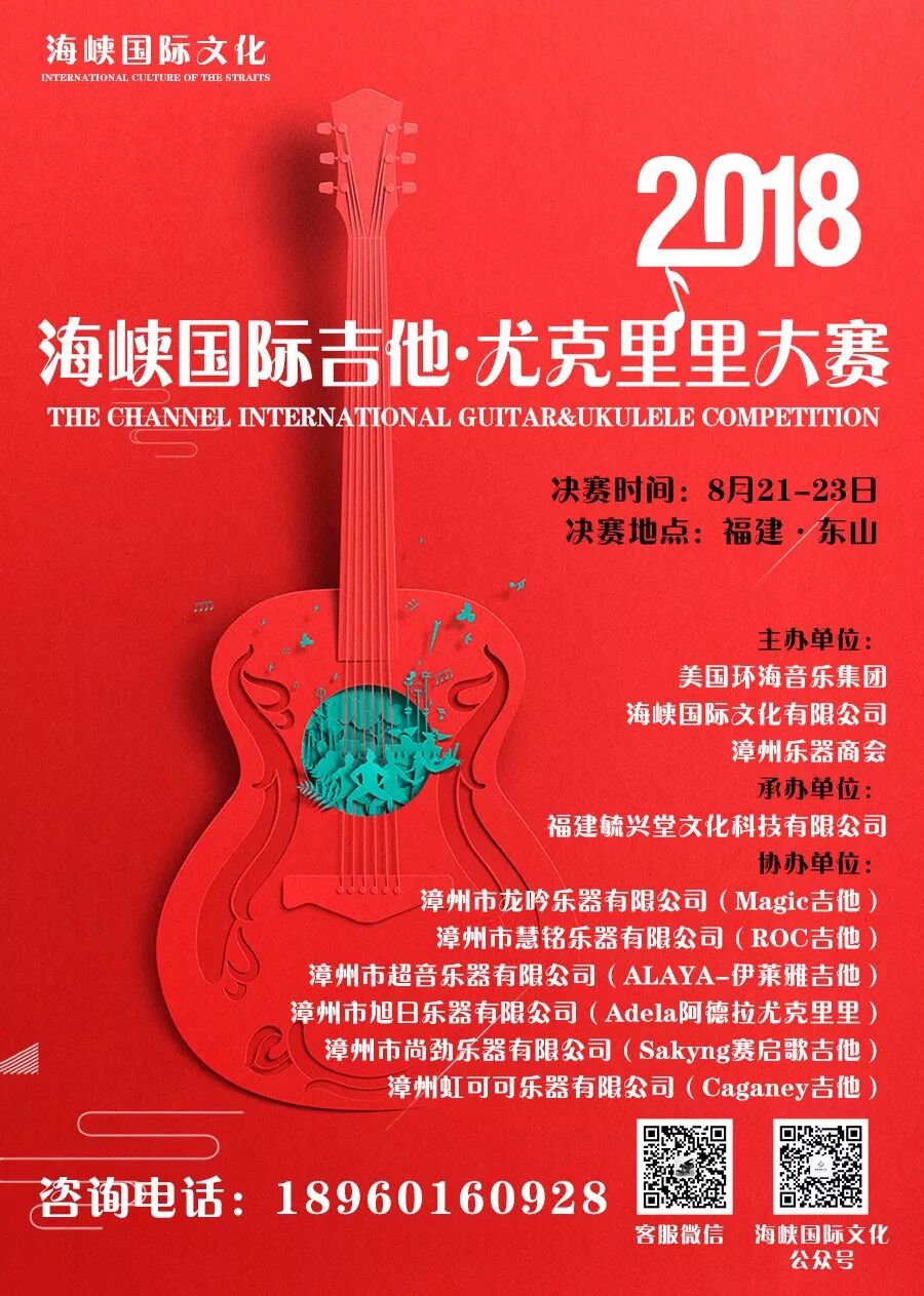 2018海峡国际吉他·尤克里里大赛即将于8月21~23日在东山岛金銮湾大酒店举办,组委会特邀请陈亮、宋依凡两位大师亲临现场举办大师吉他音乐会,参赛选手将获得门票一张,瞻仰前辈风采,更有《吉他专业化之路》讲座,让参赛选手不仅能够在赛事中表现自己的吉他演奏,还能学习了解到更深层次的吉他知识,更有沙滩音乐嘉年华,亲身感受吉他的户外音乐魅力!