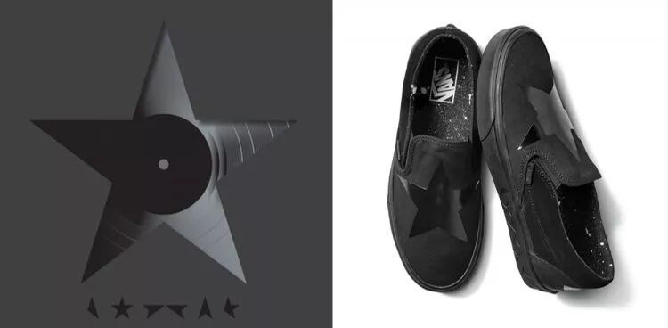 设计了这张专辑的封面的 Jonathan Barnbrook 的解释是 “Blackstar” 代表着黑暗与终结。封面底部模切的黑色五芒星亦是 “BOWIE” 的字母拼写。这样幽暗神秘又颇具玩味的设计被应用于了联名系列 Vans Classic Slip-On 当中,这双整体设计布满了 “Blackstar” 元素的鞋款,在鞋后跟有着代表左 Left / 右 Right 不对称的 “眼睛” 符号。当然,还有着在鞋侧包边代表着 “BOWIE” 名字的浮刻星状字符。
