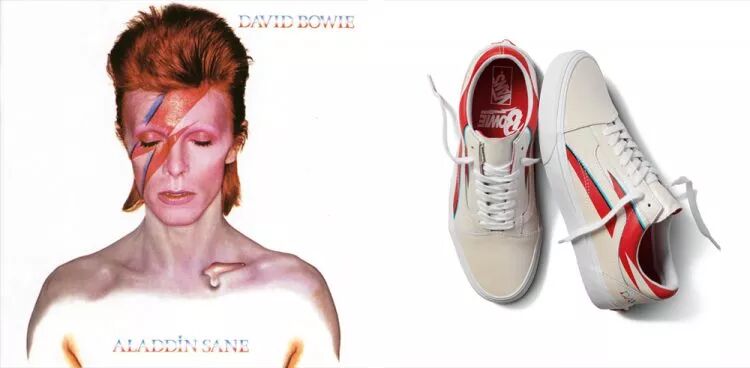 另一双承继 Ziggy Stardust 形象的经典鞋款是 Vans Old Skool ,整体的色调搭配与珍珠质感鞋身都遵循着 1973 年发行的专辑《Aladdin Sane》封面,持续着 70 年代的 Ziggy 狂热,然而这张封面中的闪电妆至今仍然是不断启发众多时尚设计师的经典标志。