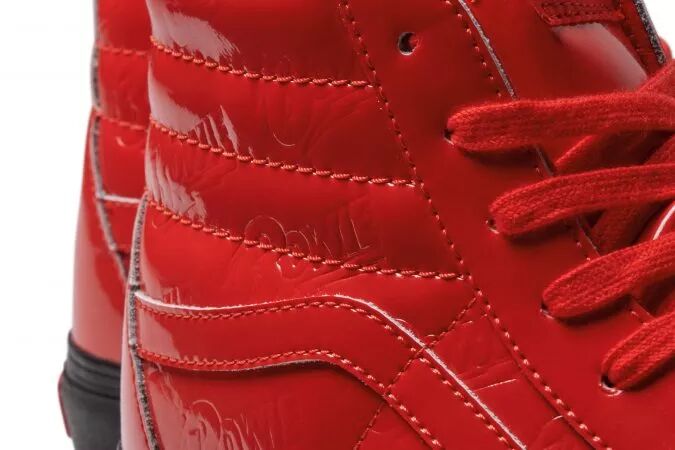 在这双 Vans Sk8-Hi Platform 2.0 上,Ziggy Stardust 形象中一些抢眼的视觉元素就被巧妙延展到鞋子之上,其中火红色就是最能代表 Ziggy Stardust 的标识之一。BOWIE 的经典 Logo 搭配上亮红色漆皮鞋面与全黑大底,将 Ziggy Stardust 的突破意义展现得淋漓尽致。