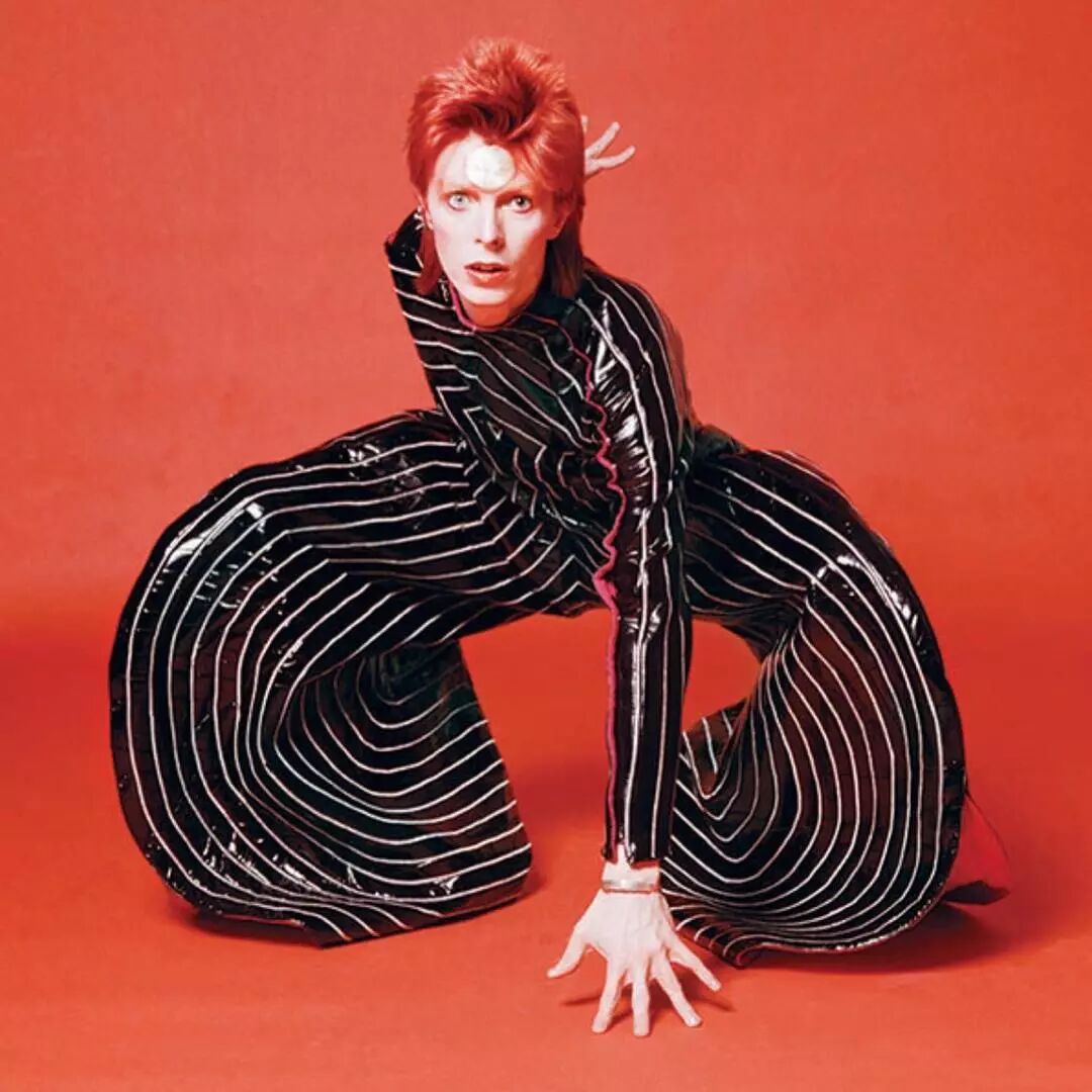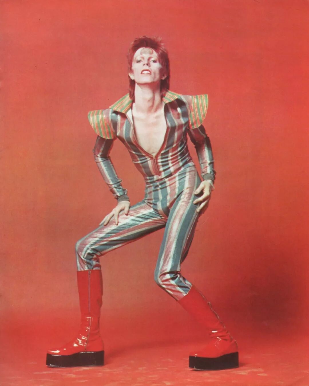 时间流逝至 1972 年夏日,当 David Bowie 身着缤纷的连身衣、梳起明亮橙红头发、脚踩高跟厚底鞋,幻化成了从外星降临地球的摇滚角色 Ziggy Stardust 时,他的一生、甚至整个 70 年代的 Glam Rock 风潮就这样开启了。