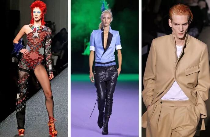 从左至右,灵感来自于 David Bowie 的 Jean-Paul Gaultier 2013 春夏系列、Haider Ackermann 2016 春夏系列、Dries Van Noten 2011 秋冬男装系列(图片来源:Getty Images)