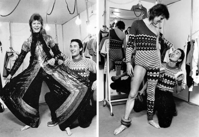 而提到 Ziggy Stardust 就必须要为大家介绍一位来自日本的设计师,山本宽斋。他在 David Bowie 的 Ziggy Stardust 时代里扮演着重要角色。1973 年 Bowie 以 Ziggy Stardust 形象拍摄最广为人知的一组照片,就是由山本宽斋操刀的造型。这位设计师曾为 Bowie 打造过一系列华丽戏剧化的紧身连体裤、及地长斗篷和彩虹针织紧身衣,都成为了曾经风靡一时的佳话。