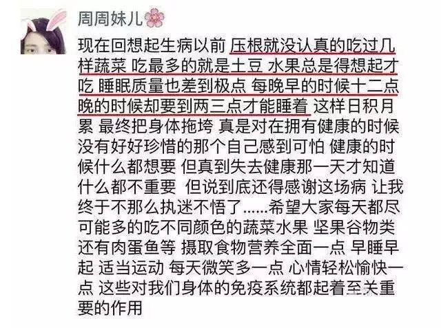 “回想生病以前,压根就没认真吃过几样蔬菜,水果也总是想起来才吃。睡眠质量差到极点,每晚早的时候12点睡,晚的时候要到两三点才睡。”