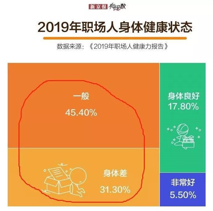 有数据显示,2019年职场人的身体健康状况,“非常好”的仅占5.5%,而处于亚健康状况的,就高达76.7%。