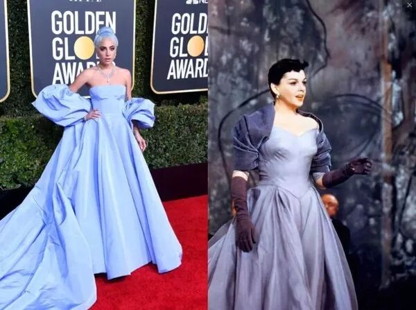 造型里还蕴藏了小心机!水蓝色Valentino泡泡袖长裙致敬了1954版《一个明星的诞生》女主Judy Garland的造型,还用了价值5,000,000美金的Tiffany 项链稍稍点缀一下,美得让人服气!
