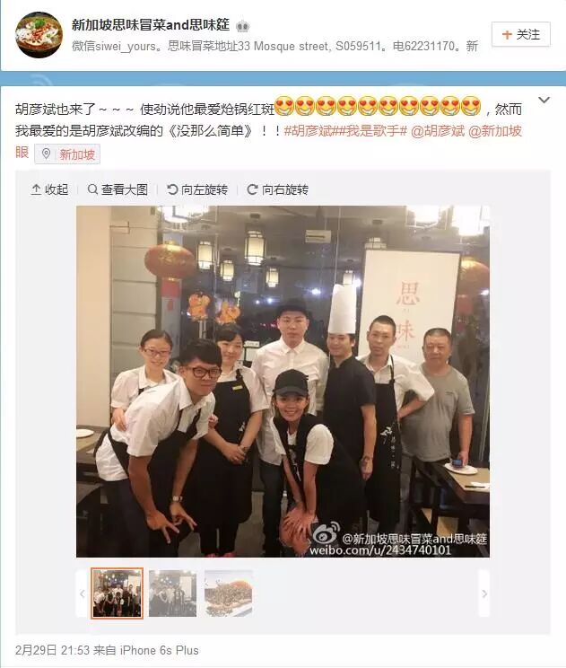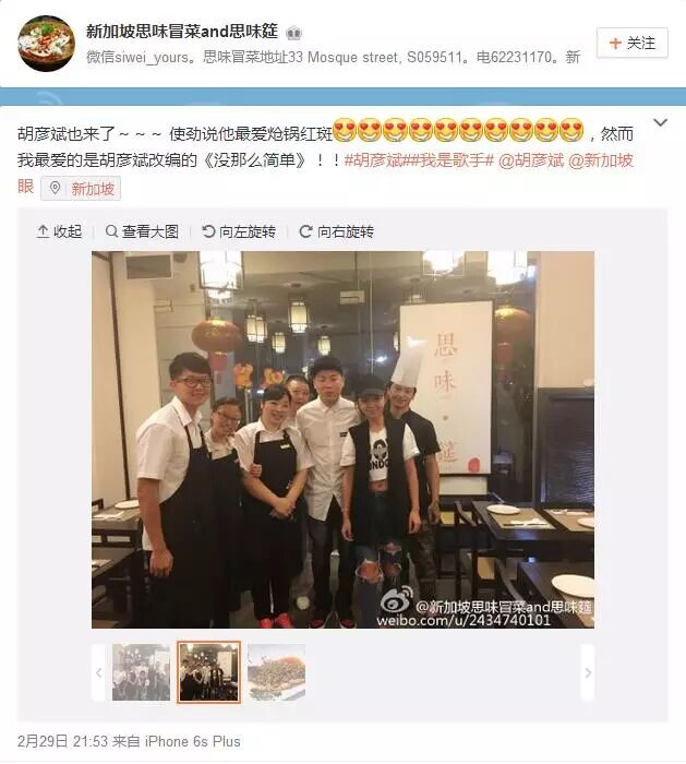 最近在我们微信上,有小老婆发来照片,爆料胡彦斌又撇下郑爽,独自游新加坡啦!这家新加坡的饭店在今年2月29日发了一条微博,称“胡彦斌也来了”,还发布了两张胡彦斌跟饭店员工的合照,不难发现胡老湿脸庞圆润,明显发福,跟女友郑爽完全是两个画风啊!