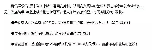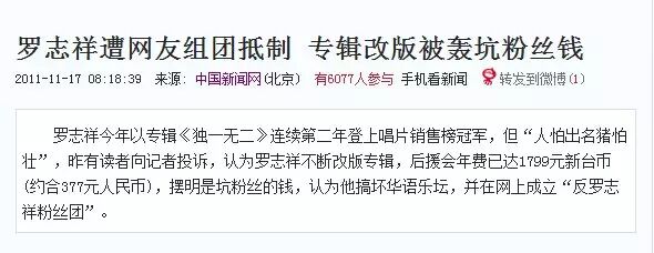 不过早在2011年,就有网友列出罗志祥的三宗罪,其中也提到了他这种捆绑销售的方式:尤其是改版专辑这点,让会长很是吃惊啊,我特意考证了一下,光是罗志祥《独一无二》这张专辑,就有日版、深情款款版、花花仕界版、影音珍藏盤、一万零一夜庆功版、内地版、限量正式版等七个版本!而这种捆绑销售的行为,让罗志祥连续四年获得唱片销量冠军。