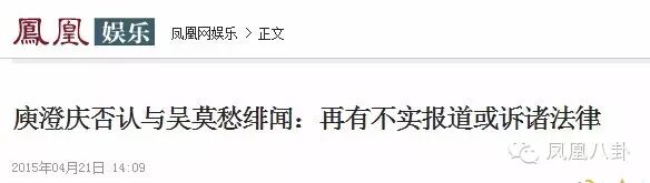 这时吴莫愁的宣传不得不站出来再次否认:“吴莫愁的确去台湾了,见老师很正常。”4月21日,这应该是庾澄庆最后一次回应这段师生恋,“之后若还有未经求证的、不是事实的报道,不排除走法律途径维权。”