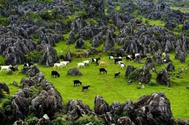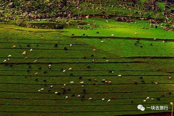 山顶古树参天,满山遍野的野花,在山坡地带觅食的牛羊,慢步走近正在吃食的牛羊,它们会呆呆地看着你,憨态可掬的萌化你的心。