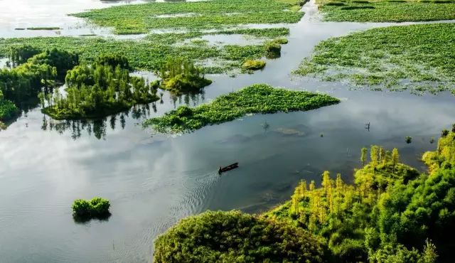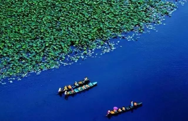 万亩荷花洒在水面,荷叶翠绿,花色多样,亭亭玉立。荡舟穿行其间,清香扑鼻,令人陶醉,如置身于诗画之中。