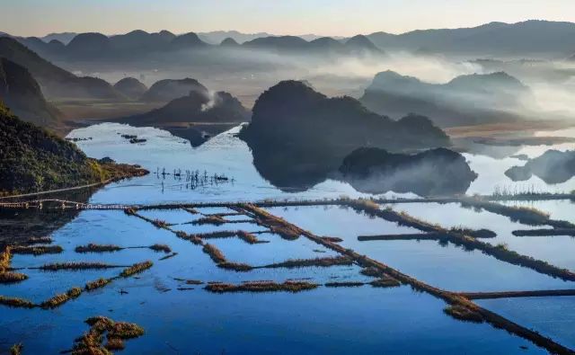 “普者黑”的意思是“鱼虾丰美的池塘”,它由80多个湖泊、200多座喀斯特小山峰、村舍、农田和草场组成,古朴而又纯净,真是一个生活在其中便能令人满足的地方!