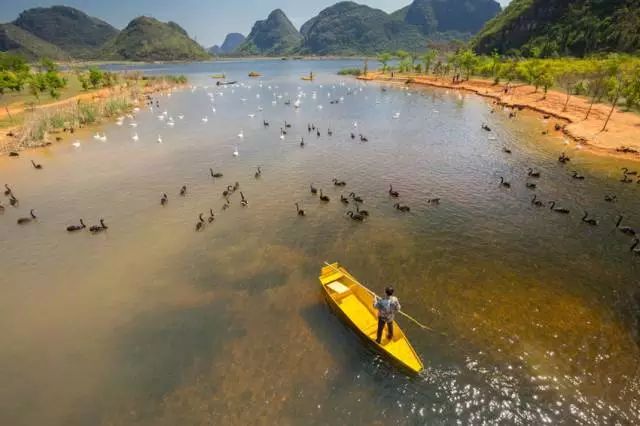 普者黑景区内的天鹅湖是世外桃源、美景天堂,也是天鹅喜爱的栖息地,这里的湿地生物极其丰富,光是候鸟就有大雁、天鹅、苍鹭、白鹭、钳嘴鹳等100多种1万多只。