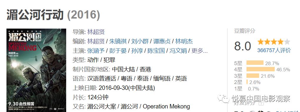本片导演是林超贤,是的,他就系辣果排协《湄公河行动》的导演,这部电影目前的豆瓣评分是这样的。