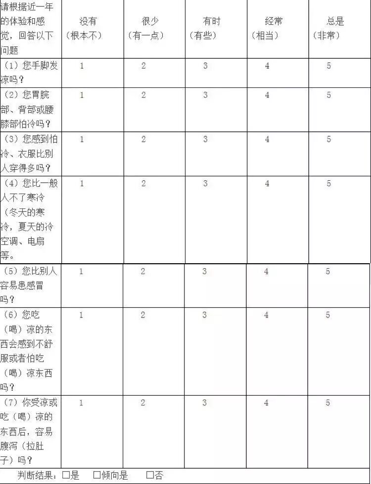 中医体质分类的判定判定方法:回答《中医体质分类与判定表》中的全部问题,每一问题按5级评分,计算原始分及转化分,依标准判定体质类型。中医体质标准化量表