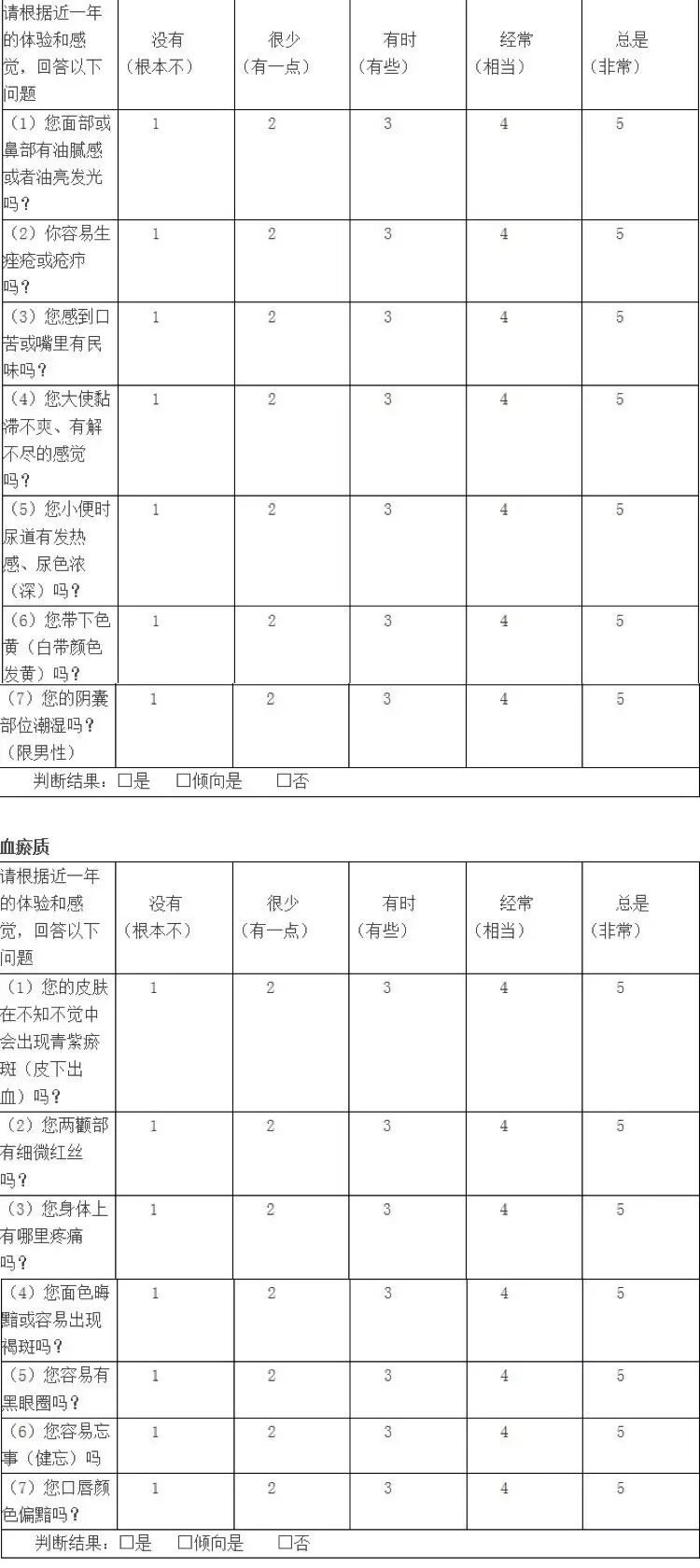 湿热质1.您面部或鼻部有油腻感或者油亮发光吗?2.您脸上容易生痤疮或皮肤容易生疮疖吗?3.您感到口苦或嘴里有异味吗?4.您大便黏滞不爽、有解不尽的感觉吗?5.您小便时尿道 有发热感、尿色浓(深)吗?6.您带下色黄(白带颜色发黄)吗?(限女性回答)7.您的阴囊潮湿吗?(限男性回答)