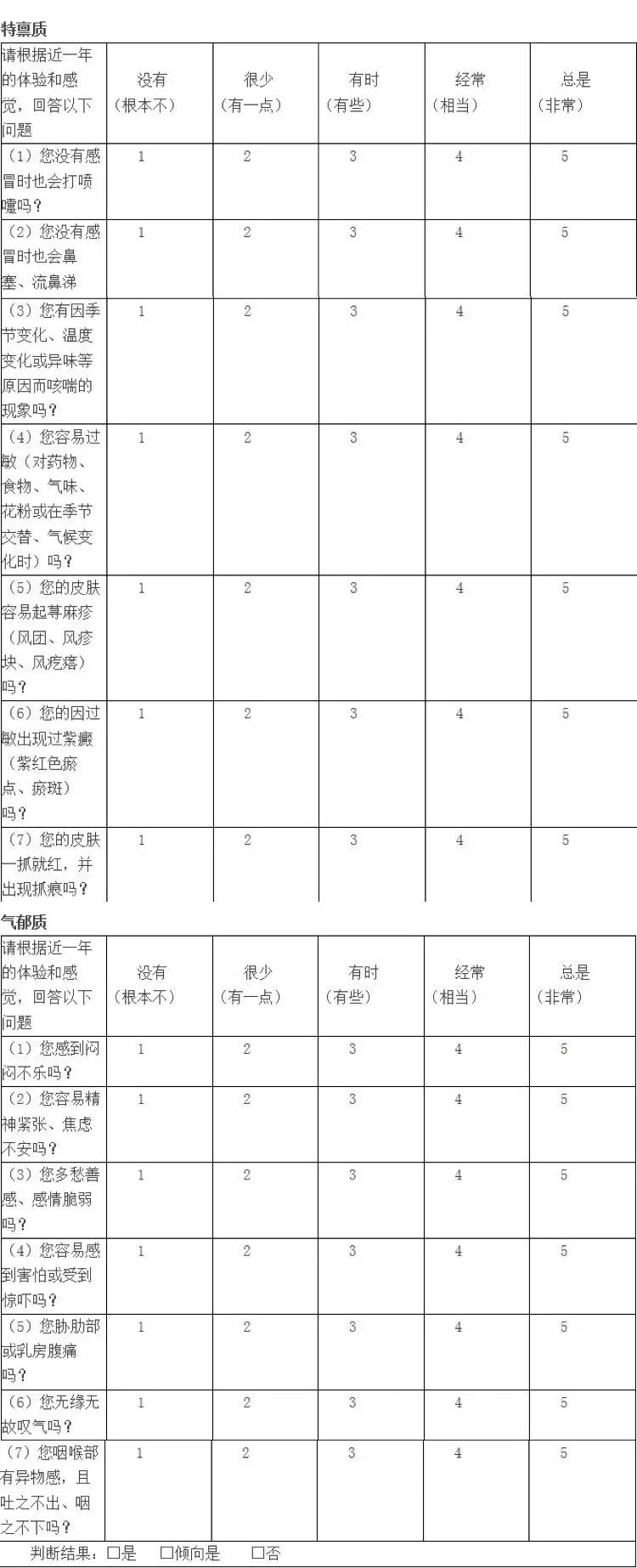 特禀质1.您没有感冒也会打喷嚏吗?2.您没有感冒也会鼻塞、流鼻涕吗?3.您有因季节变化、温度变化或异味等原因而咳喘的现象吗?4.您容易过敏(药物、食物、气味、花粉、季节交替时、气候变化等)吗?5.您的皮肤起荨麻疹(风团、风疹块、风疙瘩)吗?6.您的皮肤因过敏 出现过紫癜(紫红色瘀点、瘀斑)吗?7.您的皮肤一抓就红,并出现抓痕吗?