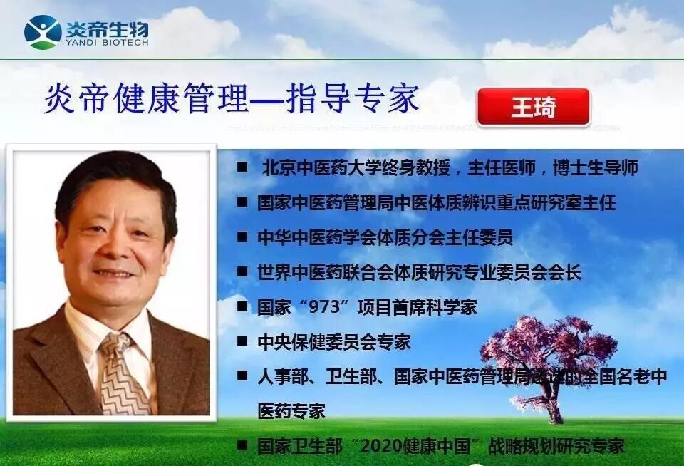 体检是源于对自身健康状态的关注,其终点不应该是一纸体检报告,而是应该在了解身体具体状况后进行后续的健康管理。炎帝生物健康管理平台致力于向客户提供可持续的健康管理服务。一是对健康的管理,另一个是对体质状况的调理。对于炎帝生物的会员和体验用户,将享受免费健康检测一次,有任何健康问题,客户都可以与健康管理中心联系。炎帝公司健康管理总顾问王琦教授为中医九种体质创始人炎帝公司健康管理总顾问王琦教授为中医九种体质创始人炎帝公司健康管理总顾问王琦教授王琦教授简介: