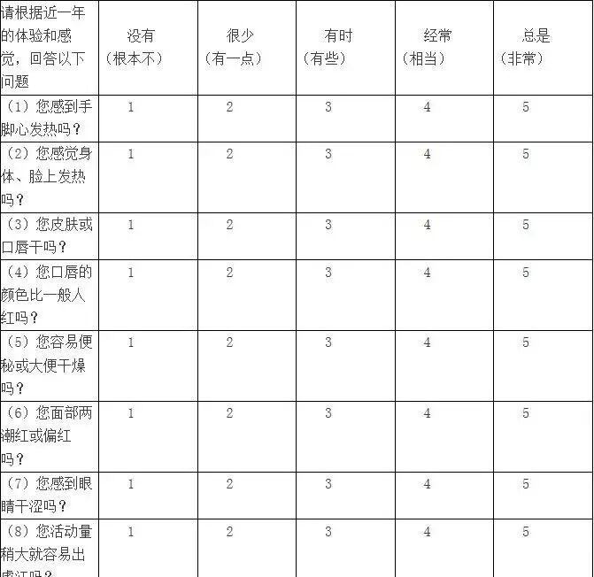 阳虚质1.您手脚发凉吗?2.您胃脘部、背部 或腰膝部怕冷吗?3.您感到怕冷、衣服比别人穿得多吗?4.您冬天更怕冷,夏天不喜欢吹电扇、空调吗?5.您比别人容易患感冒吗?6.您吃(喝)凉的东西会感到不舒服或怕吃(喝)凉的吗?7.您受凉或吃(喝)凉的东西后,容易腹泻、拉肚子吗?阴虚质1.您感到手脚心发热吗?2.您感觉身体、脸上发热吗?3.您皮肤或口唇干吗?4.您口唇的颜色比一般人红吗?5.您容易便秘或大便干燥吗?6.您面部两颧潮红或偏红吗?7.您感到眼睛干涩吗?8.您感到口干咽燥、总想喝水吗?