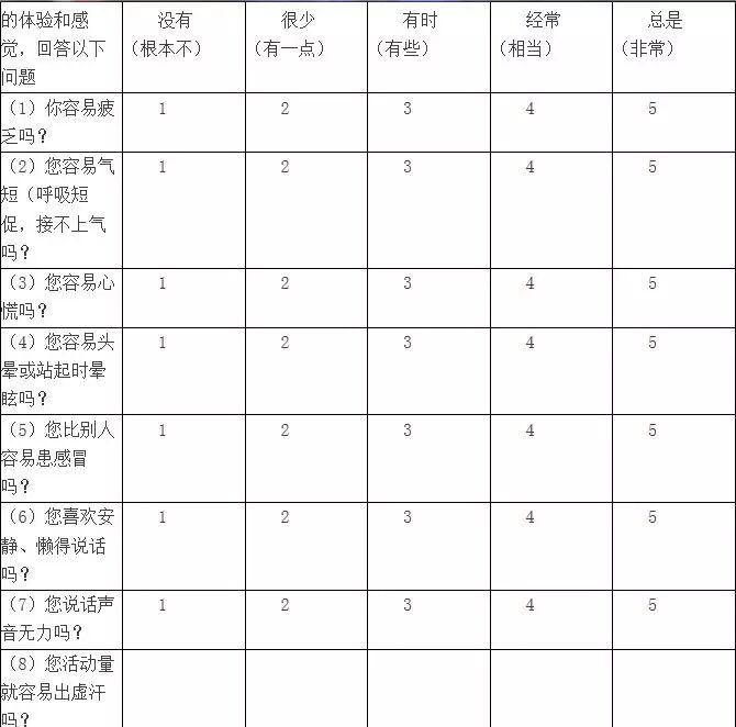 气虚质1.您容易疲乏吗?2.您容易气短(呼吸短促,接不上气)吗?3.您容易心慌吗?4.您容易头晕或站起时晕眩吗?5.您比别人容易感冒吗?6.您喜欢安静、懒得说话吗?7.您说话声音低弱无力吗?8.您活动量稍大就容易出虚汗吗?