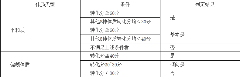 示例2:某人各体质类型转化分如一:平和质75分,气虚质16分,阳虚质27分,阴虚质25分,痰湿质32分,湿热质25分,血瘀质10分,气郁质 18分,特禀质10分。根据判定标准,平质转化分≧60分,同时,痰湿质转化分在30~39之间,可判定为痰湿质倾向,故此人最终体质判定结果基本是平和质,有痰湿质倾向。