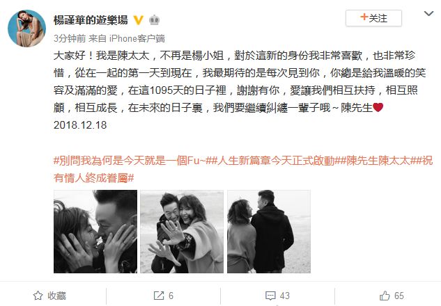 今天,41岁的杨谨华在微博上公布了自己已经和相恋3年的男友领证结婚的好消息。