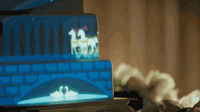 当灯光渐暗,蛋糕上会出现繁星布满天空。南瓜马车在星空下驶向王子的城堡,护城河中有白天鹅深情对视组成了心的形状。