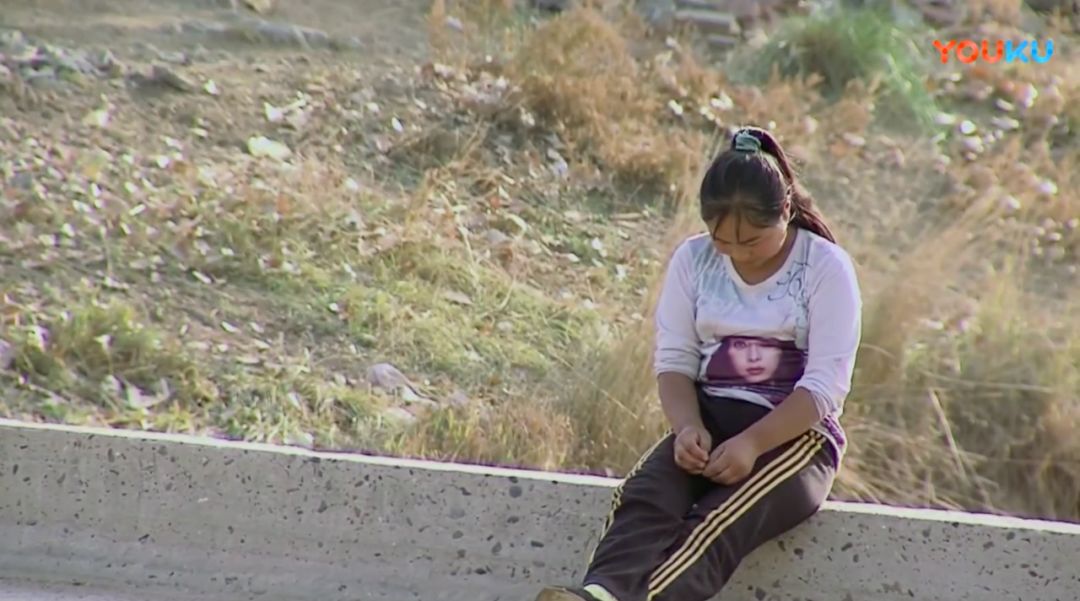 她坐在马路边,时而摇摇头,时而低下头。还是不想看镜头。