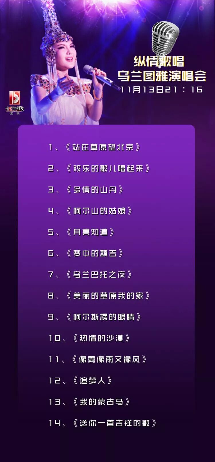11月13日21:16《CCTV音乐厅》将为您奉上《纵情歌唱·乌兰图雅演唱会》。蒙古之花乌兰图雅将用自己最淳朴的声音深情歌唱对家乡的爱恋,为观众带来视觉与听觉上的双重享受。