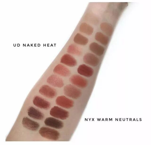 要知道香奈儿和naked heat这两个网红盘加起来,就算找代购价格也在1000左右才能买下来,而NYX只要168块就能搞定。你们可以看下NYX和naked heat的试色对比,不论是显色度还是粉质都很相似。