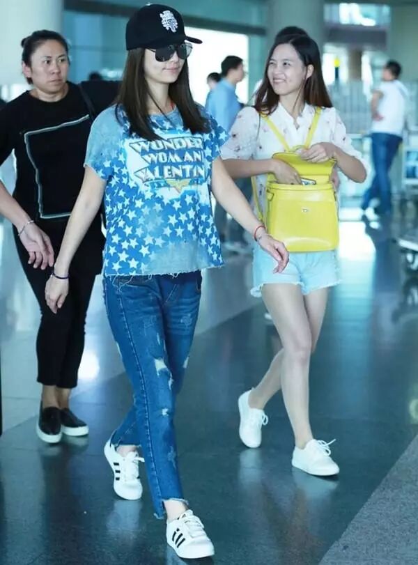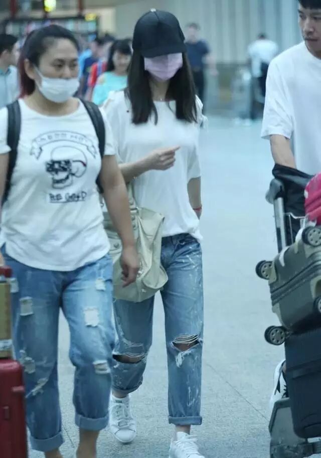 在机场看到的试穿这件做旧款的脏T恤,搭配不规则的破洞牛仔裤,毛边儿很时髦,搭休闲平底鞋,穿出了街头潮范儿,自然又舒服。