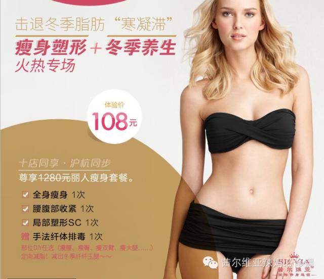 茜尔维亚独家“产后调理瘦” 2016女神“健康瘦身法” 即日起至2016年2月29日,仅需【108元】,就可以尊享茜尔维亚价值【1280元】的瘦身体验套餐1次,包含4个项目; 全身瘦身 1次; 腰腹部瘦身 1次; 局部塑形sc 1次; 手法纤体排毒 1次; 茜尔维亚美丽热线:400-880-2058 点击【阅读原文】填写报名信息,即可参与! 温馨TIPS 本福利仅限新客人体验; 本福利每人仅限体验1次; 本福利不与茜尔维亚其他团购或优惠共享; 本福利限上海及杭州地区女性尊享! 门店信息,请滑动至文末可见 welcome 如何抢到瘦身体验福利! 点击【阅读原文】填写报名信息,即可参与!