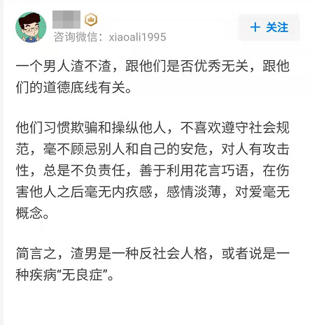 一个男人渣不渣,跟他们是否优秀无关,跟他们的道德底线有关。他们习惯操作和欺骗他人,总是不负责任,善于利用花言巧语,在伤害他人之后毫无愧疚感,感情淡漠。