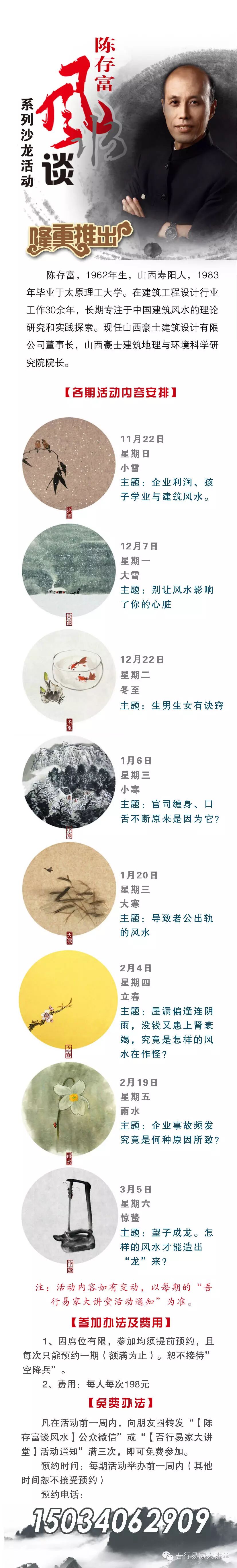 【免费办法】凡在活动前一周内,向朋友圈转发“【陈存富谈风水】公众微信ccftfs”或“【吾行易家大讲堂】活动通知”满3次,即可免费参加。