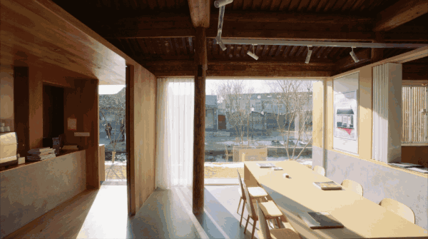 打开像木盒子一般的通道式入口,进入室内,简约的装修,书架和桌椅都是一水儿原木和白色,装点着绿植。但地面、屋顶和柱子还保留着老房子最初的样子。